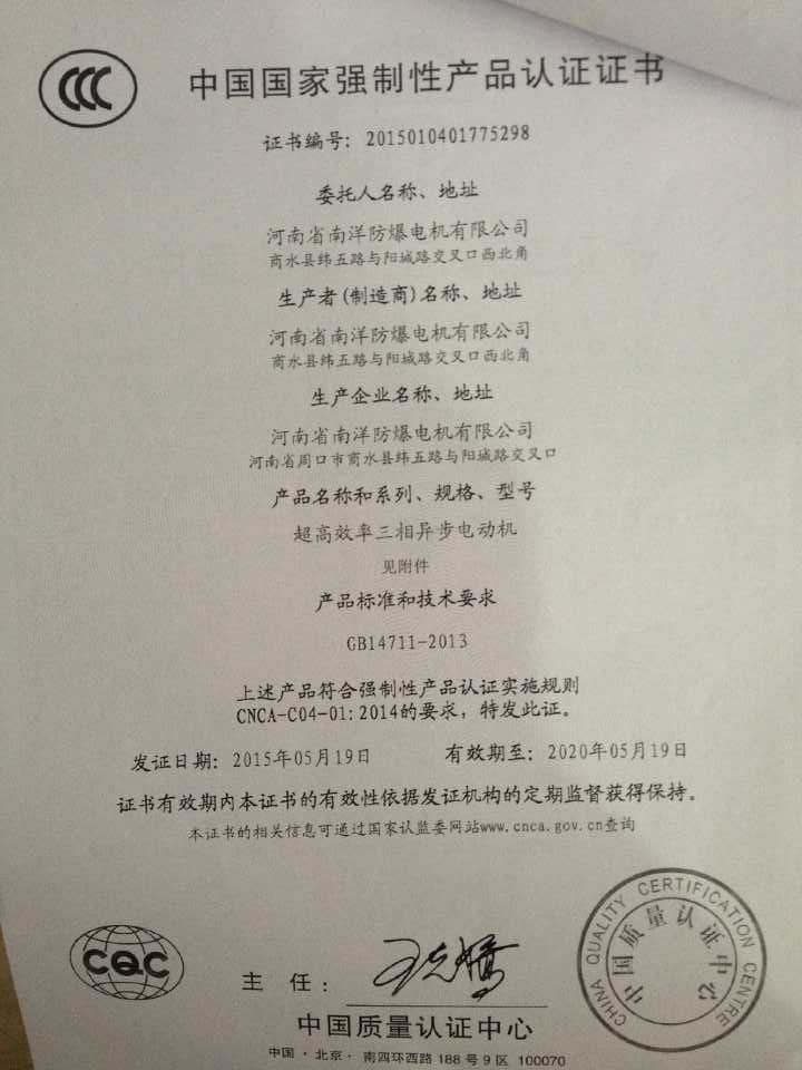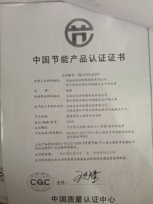 在2015年5月19日的這一天,對于河南省南洋防爆電機(jī)有限公司來說是值得慶祝的一天。因為就在這一天公司獲得了YE3系列超高效率隔爆型電動機(jī)的雙重產(chǎn)品認(rèn)證證書。也就是說在這一天河南省南洋防爆電機(jī)有限公司可以投入YE3超高效率隔爆型電動機(jī)的生產(chǎn)了。至此普天同慶的時刻,河南省南洋防爆電機(jī)有限公司董事長王科偉先生代表公司對做出這一貢獻(xiàn)的廣大同仁表示慰問和感謝。