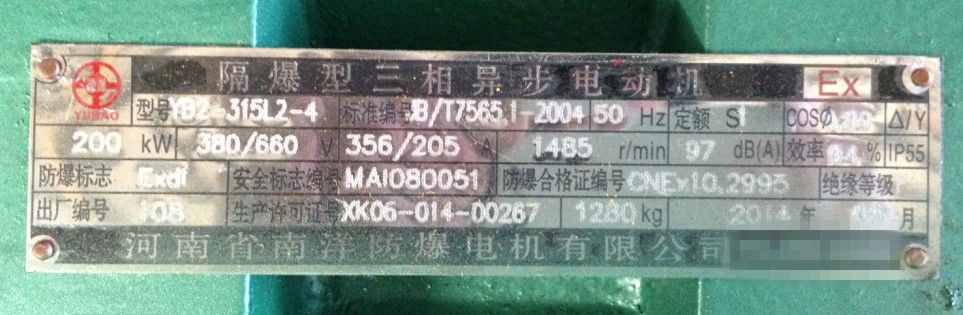 上面羅列的YB2系列防爆電機(jī)的型號(hào)315L2-4,功率200KW,電壓380/660V,電流356/205A,轉(zhuǎn)速1485r/min,效率94%,防護(hù)等級(jí)IP55,防爆標(biāo)志EXDI,絕緣等級(jí)F,重量1280KG,生產(chǎn)日期2014年9月,頻率50Hz等等。在上面都可以找到。而標(biāo)準(zhǔn)編號(hào)表示的是YB2系列防爆電機(jī)一定要符合這個(gè)標(biāo)準(zhǔn)才算是合格產(chǎn)品,最重要的就是上面的安全標(biāo)志編號(hào)、防爆合格證編號(hào)和生產(chǎn)許可證號(hào)一定要與給到咱們的各種證件上面一一對(duì)應(yīng)。要是對(duì)不上一定要通知廠家要求重新發(fā)貨。