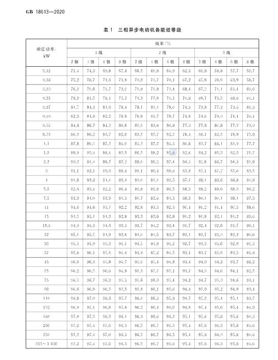 (2)提高了對(duì)三相異步電動(dòng)機(jī)能效限定值要求(見表1,GB18613-2012的表1和GB 25958—2010的表1);